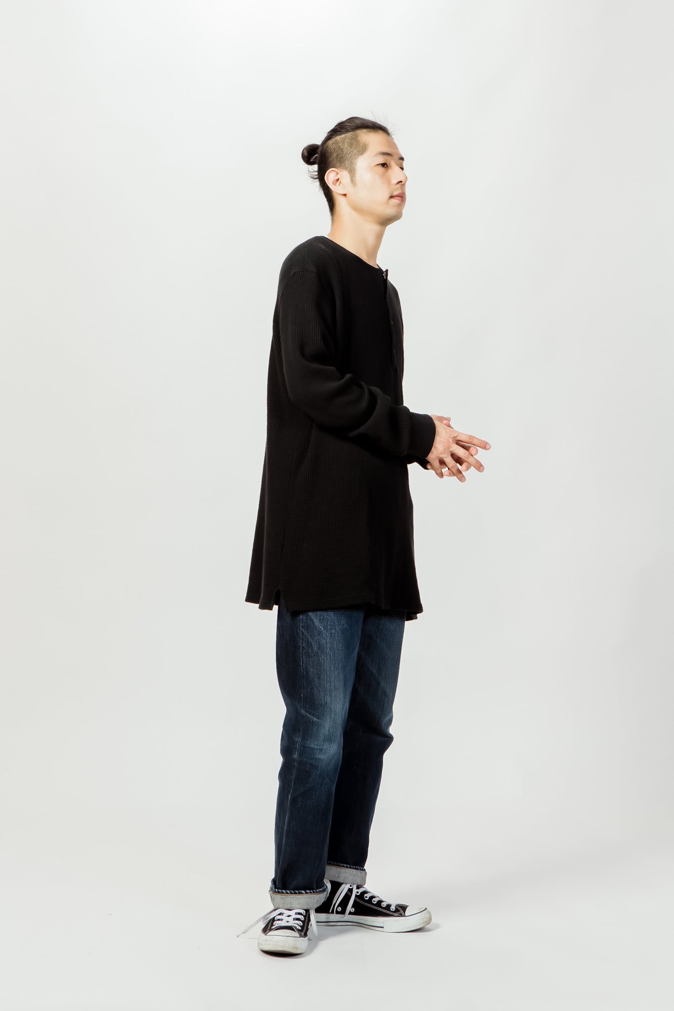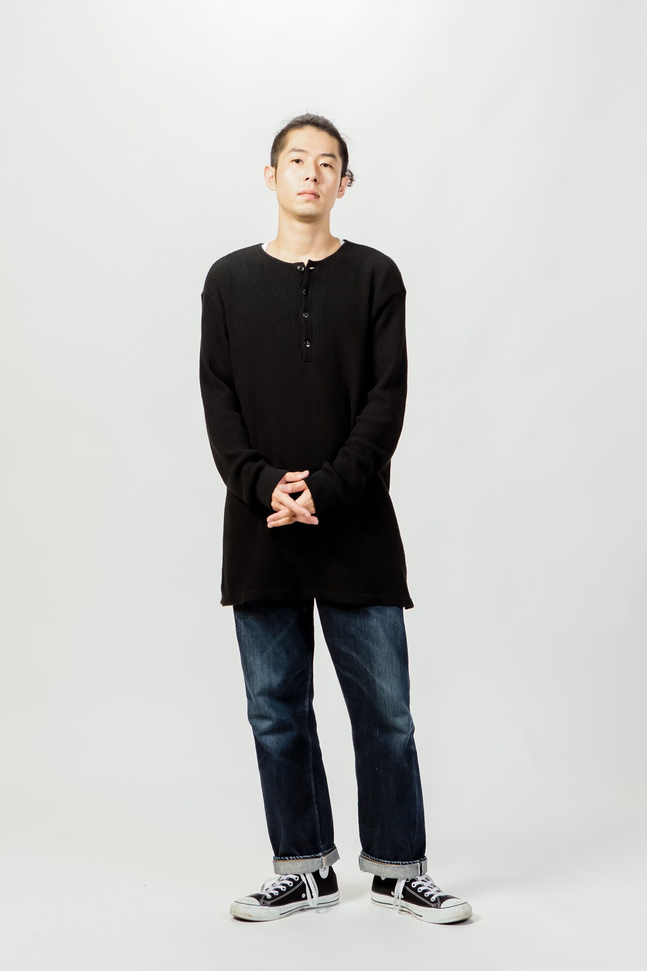 肉厚の柔らかいワッフル生地に、異なる4種類のボタンを付けたヘンリーネックタイプのサーマルカットソー。