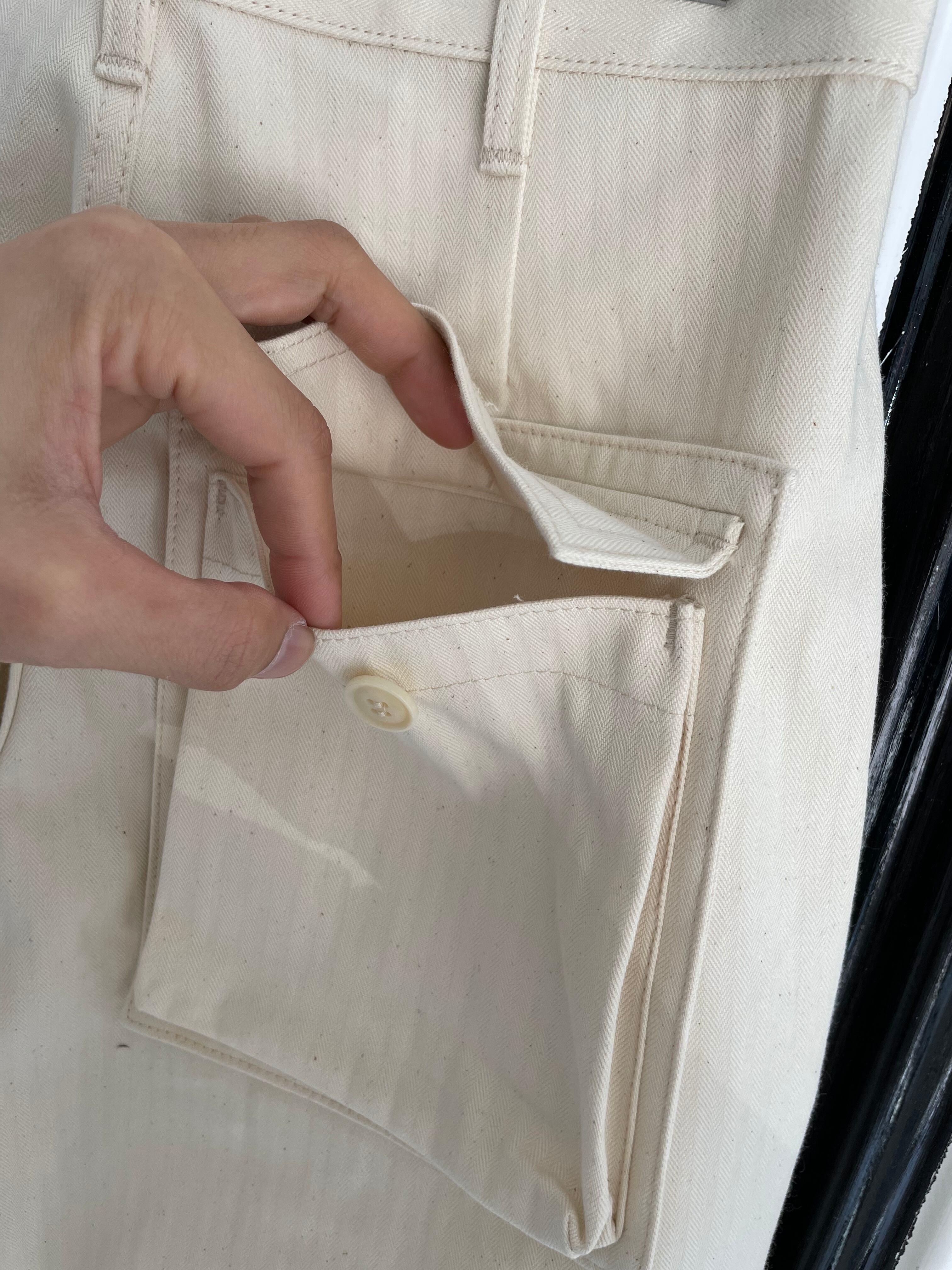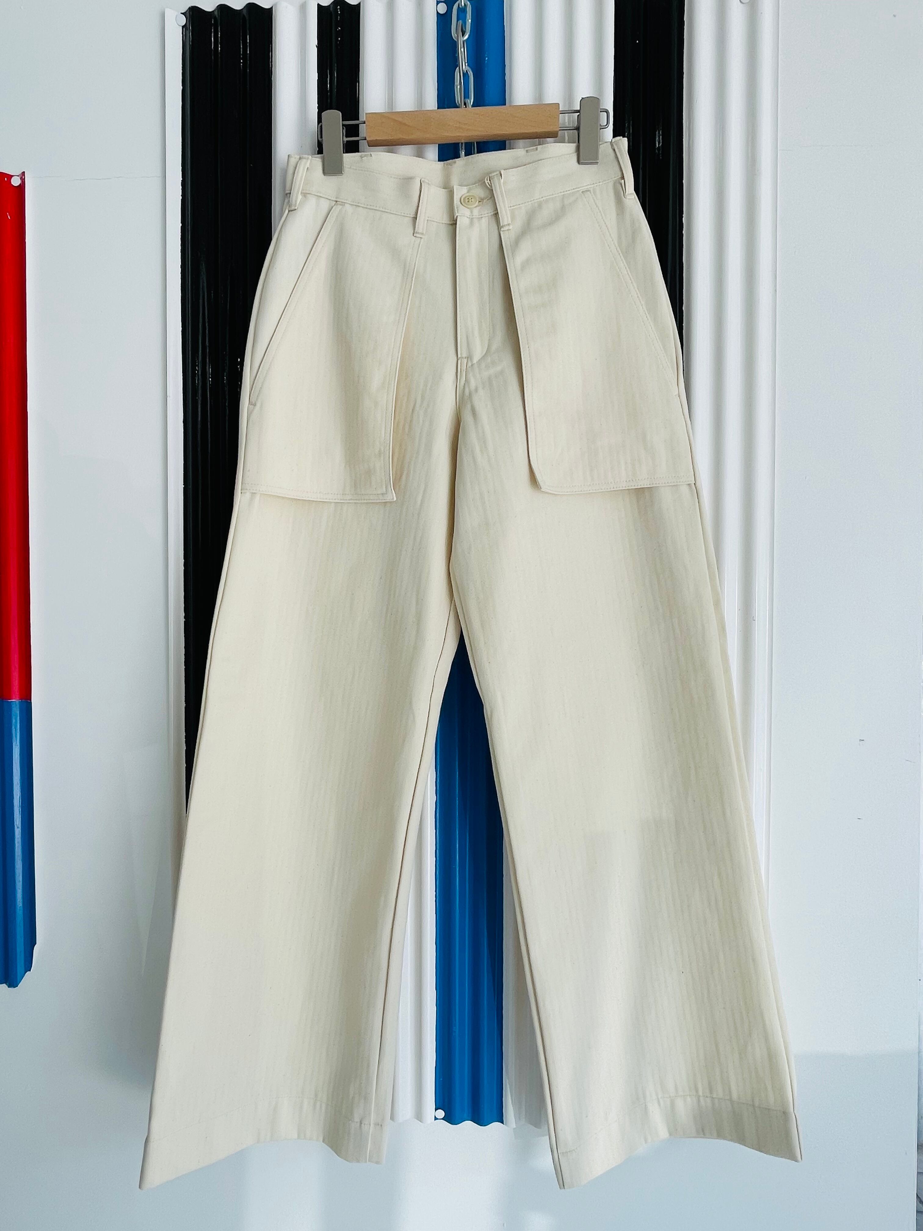ベイカーパンツのフロントポケットを浮かび上がらせたようなデザインのパンツです。